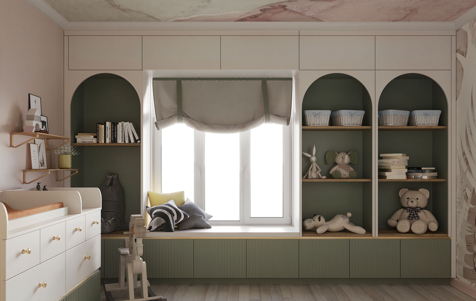 По бокам окна — открытые полки, обрамлённые арками в цвет фасада. Это не только стильное решение, но и удобное место для часто используемых игрушек, книг или декора. Всё продумано так, чтобы ребёнок мог легко доносить до нужной вещи и чувствовать себя комфортно.